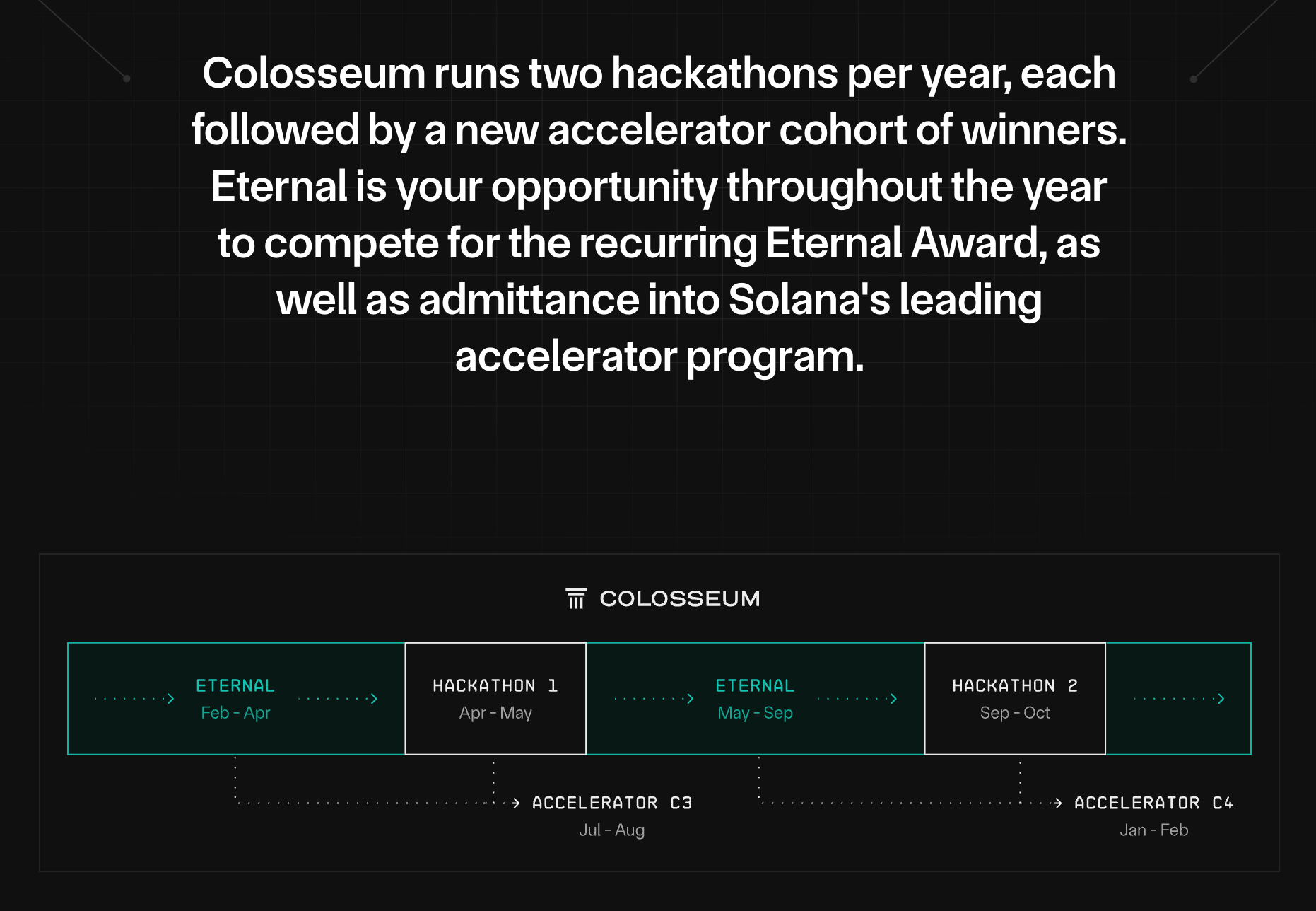 콜로세움(Colosseum)은 해커톤, 액셀러레이터, 벤처 펀드 세 가지 핵심 축을 하나로 통합해 운영하는 솔라나 생태계 조직입니다. 솔라나 재단 및 생태계 전반을 위해 연 2회 온라인 해커톤과 상시 지원 프로그램인 'Eternal 챌린지'를 개최합니다.